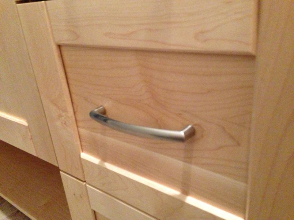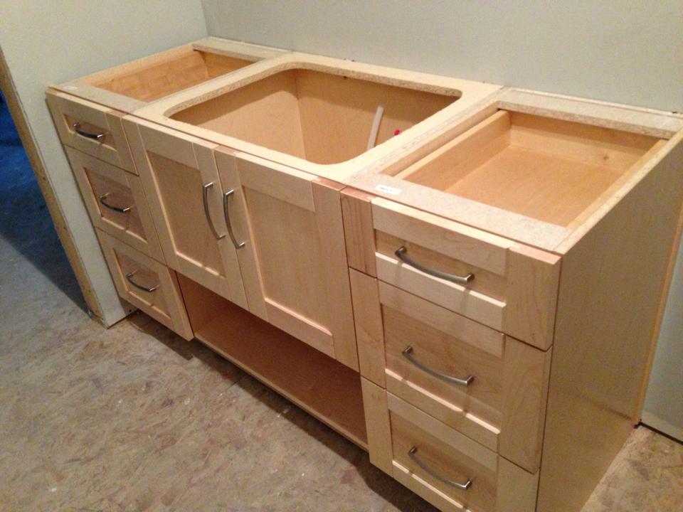 The bathrooms cabinets are the same natural maple we have gone with in the kitchen. There is a bank of drawers for each kid in their bathroom and the open shelf on the bottom will hold extra towels.