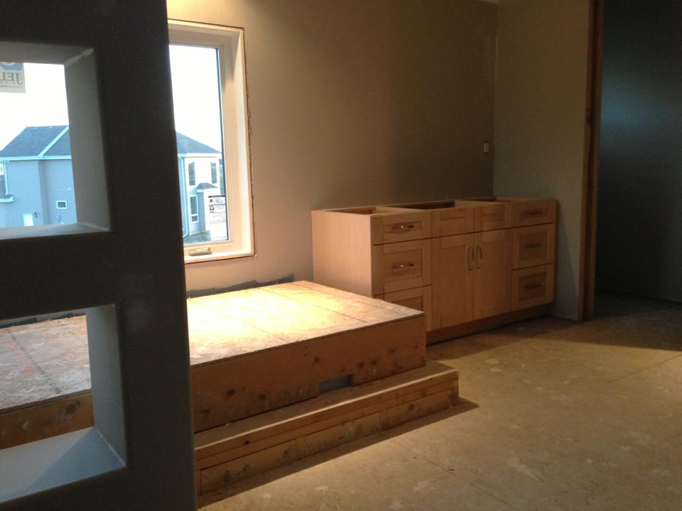 I absolutely love the steps up to our ensuite and the built in shelves we added beside the soaker tub. The shower will be on the other wall, but I will get to that once tile is started.