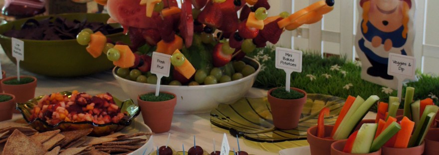The main food table was decorated with mushrooms, fake grass and plants, and a white picket fence. A banner with the Bride and Groom’s name was strung across two topiary trees and cardboard cut-outs of gnomes were placed throughout.