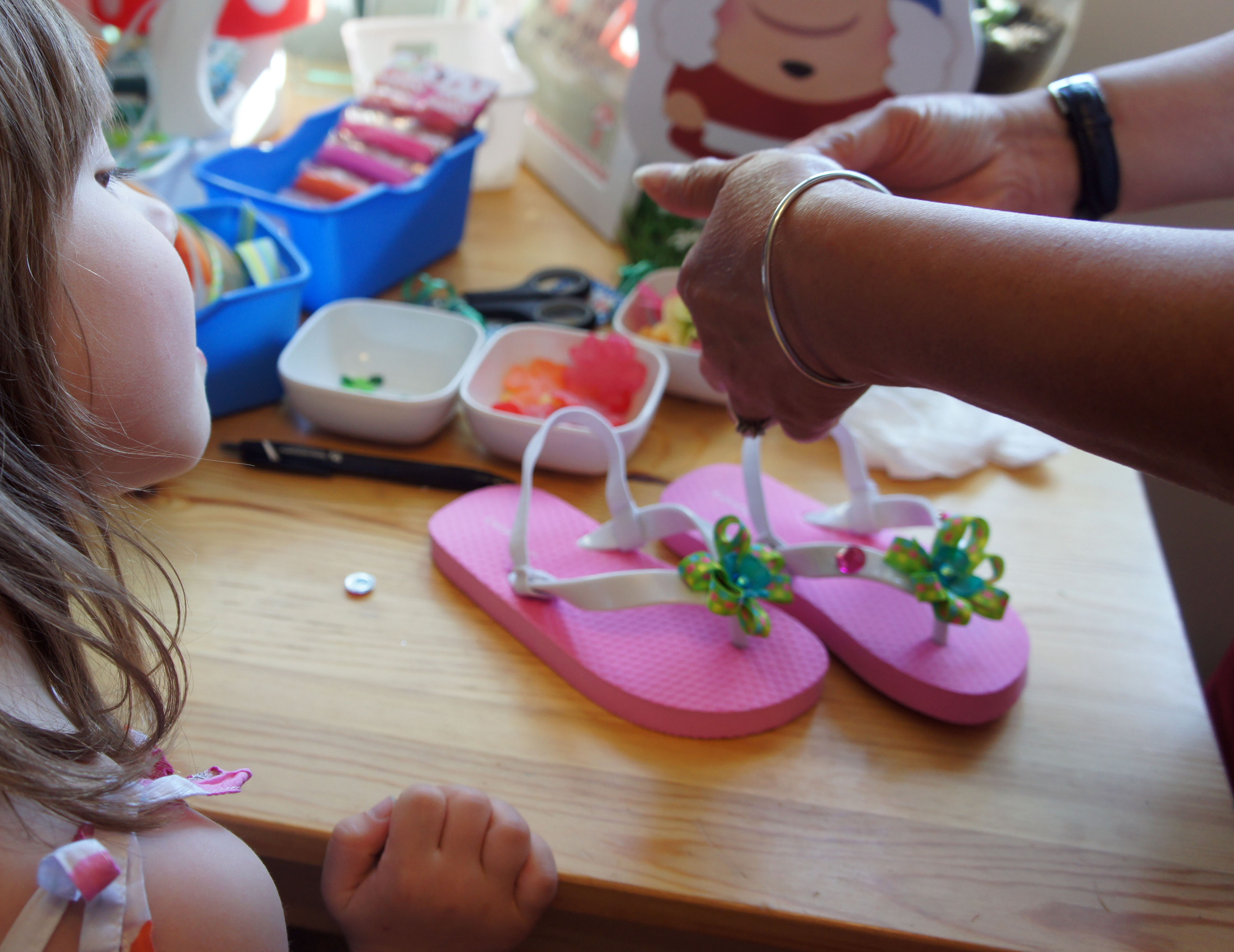 For favors and an activity, I had a flip flop decorating station. The guests were asked to RSVP with their shoe size and favorite color and I picked everyone out a pair of flip flops when Old Navy had their $1 flip flop sale. Glue guns, ribbons, beads and flowers were provided and guests went to working adding a little extra pizazz to their new sandals. It ended up being a lot of fun to see what everyone came up with and guests then had a pair of comfy shoes to bring to the casual camp themed wedding.