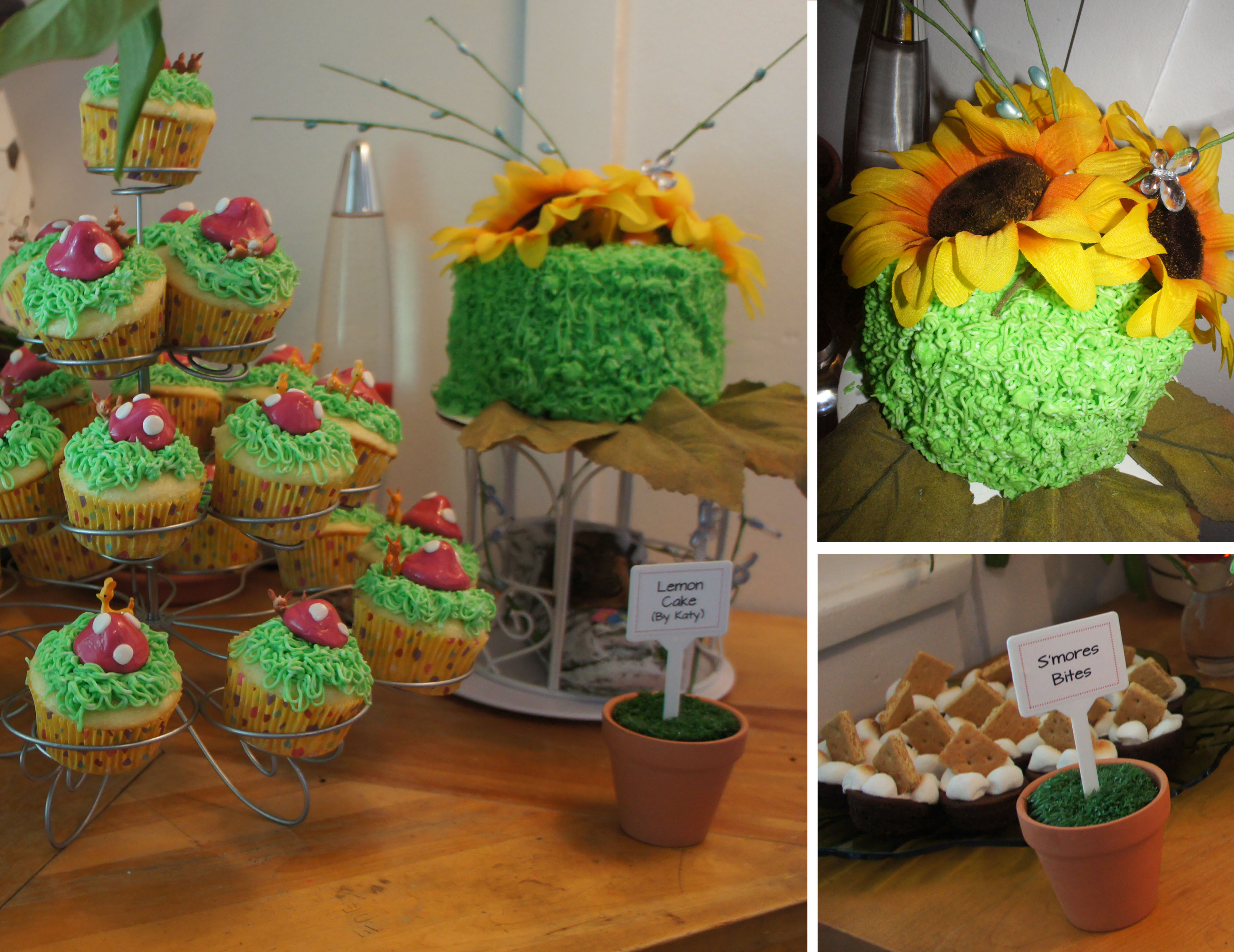 Desserts included s’mores bites and a beautiful cake with adorable toadstool cupcakes made by our friend Katy.