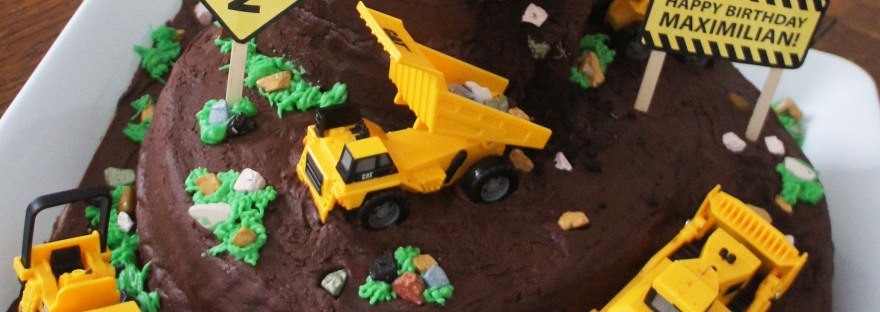 Finishing details included green icing grass and small chocolate rocks. The “dirt” was Oreo cookie crumbs. For the final touches, I printed out some construction style signs with the birthday boy’s name and age to stick into the cake with the “2” candle.