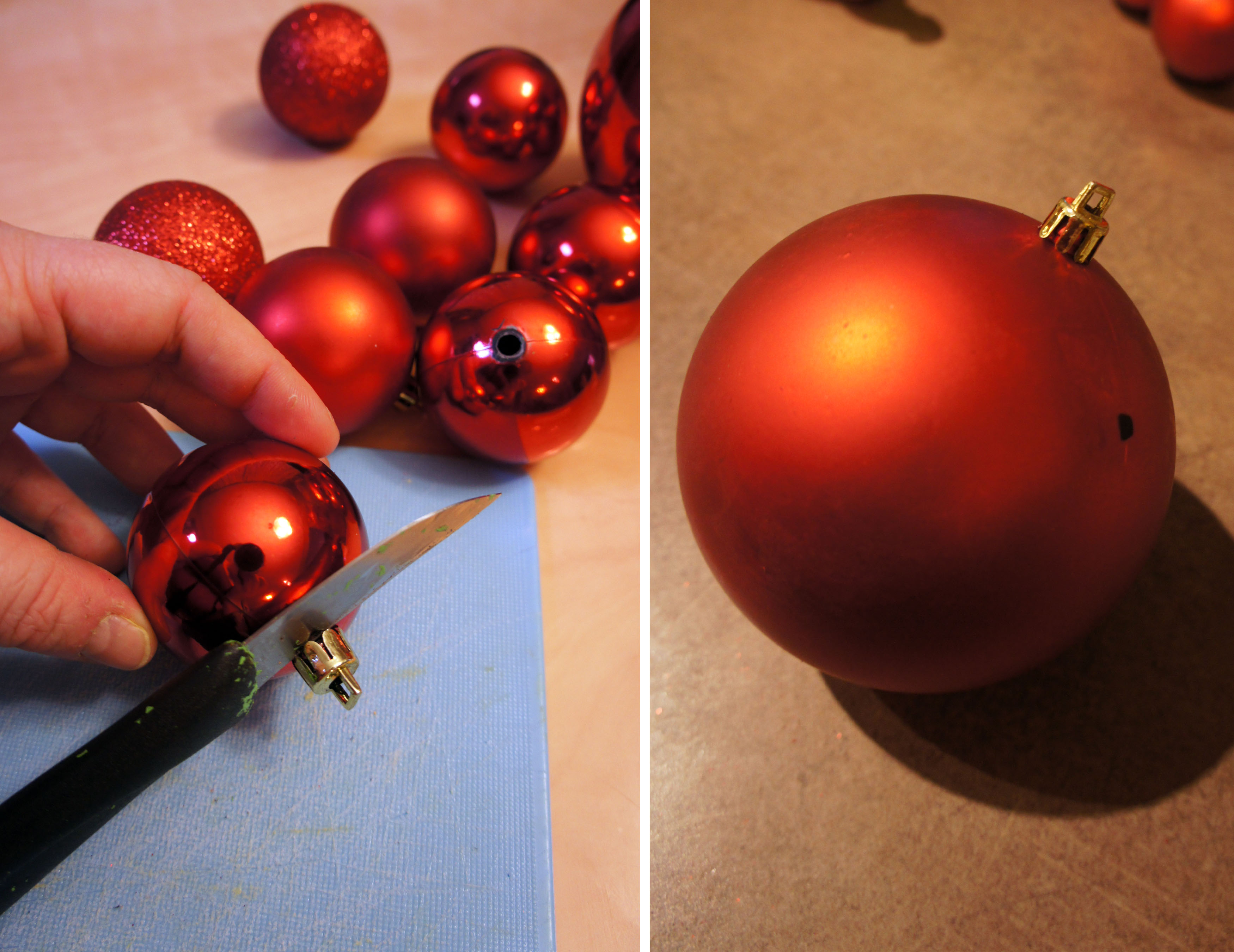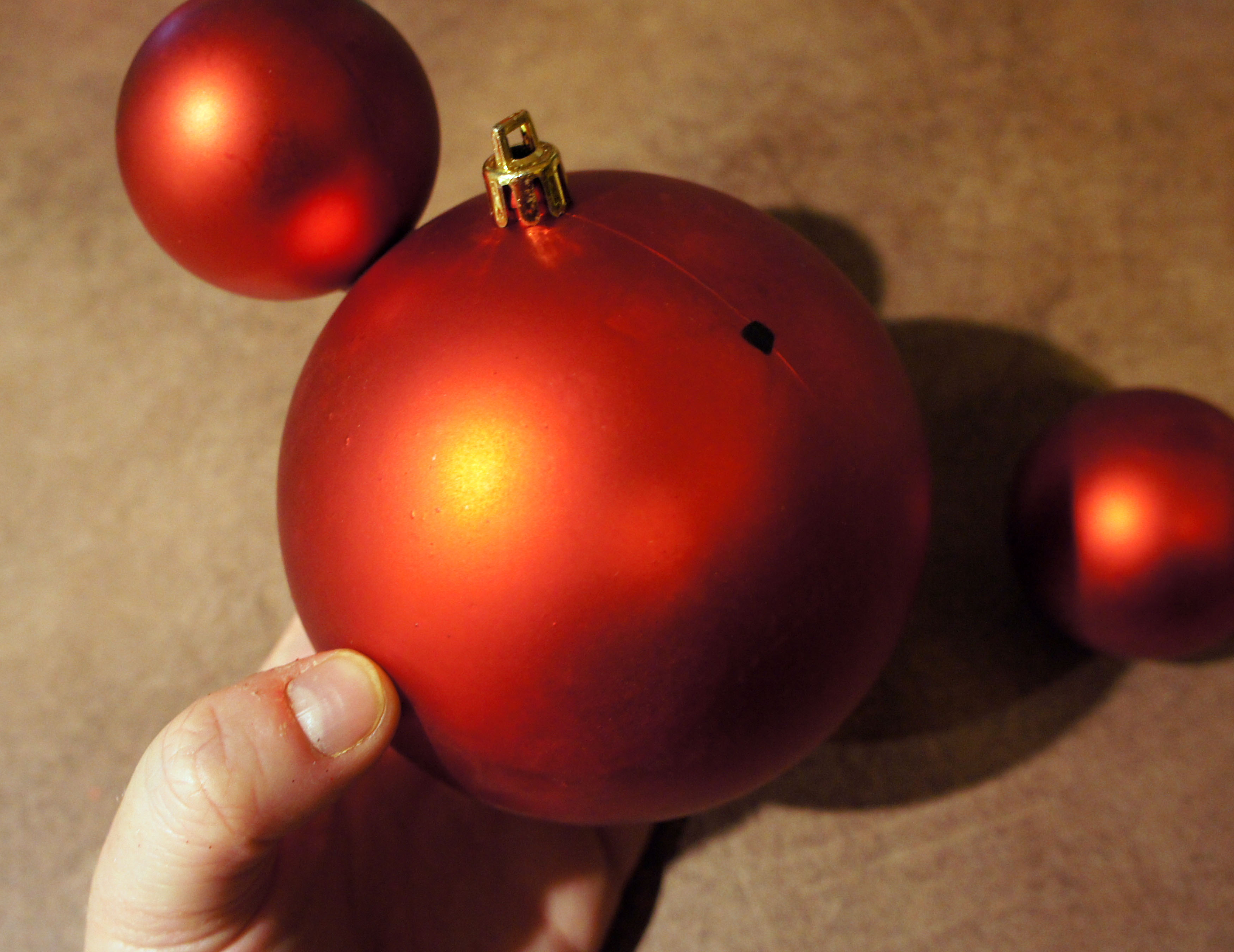 1. Using a sharp knife, begin by cutting the ornament hanging ends off each of the smaller balls. This will allow your ears to sit flat onto the “heads”.