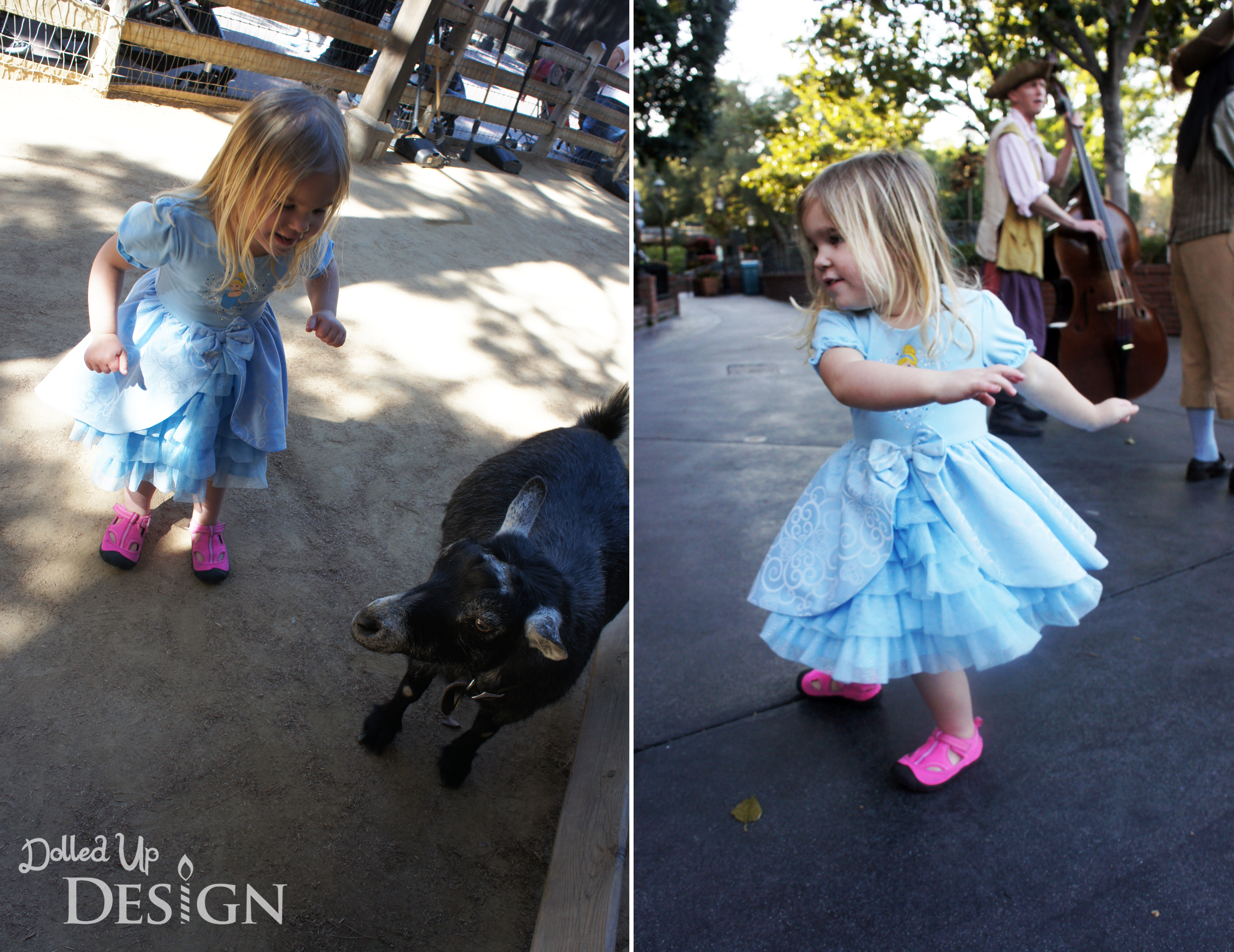 BUT I was also afraid after seeing all the other little girls in the park wearing their Princess dresses that she would be upset. In the past month, she definitely hit the terrible two stage full-on and has become very headstrong if there is something she sees and wants. Before the trip, I downloaded the Disneyland app to my phone and she repeatedly went to the Fantasy Faire section to pull-up the pictures of the princesses to point to the dresses and proclaim “I want dat!”. I know they do sell much better quality dress-up costumes in the parks, but there are still a lot of itchy materials and the length issue to consider.