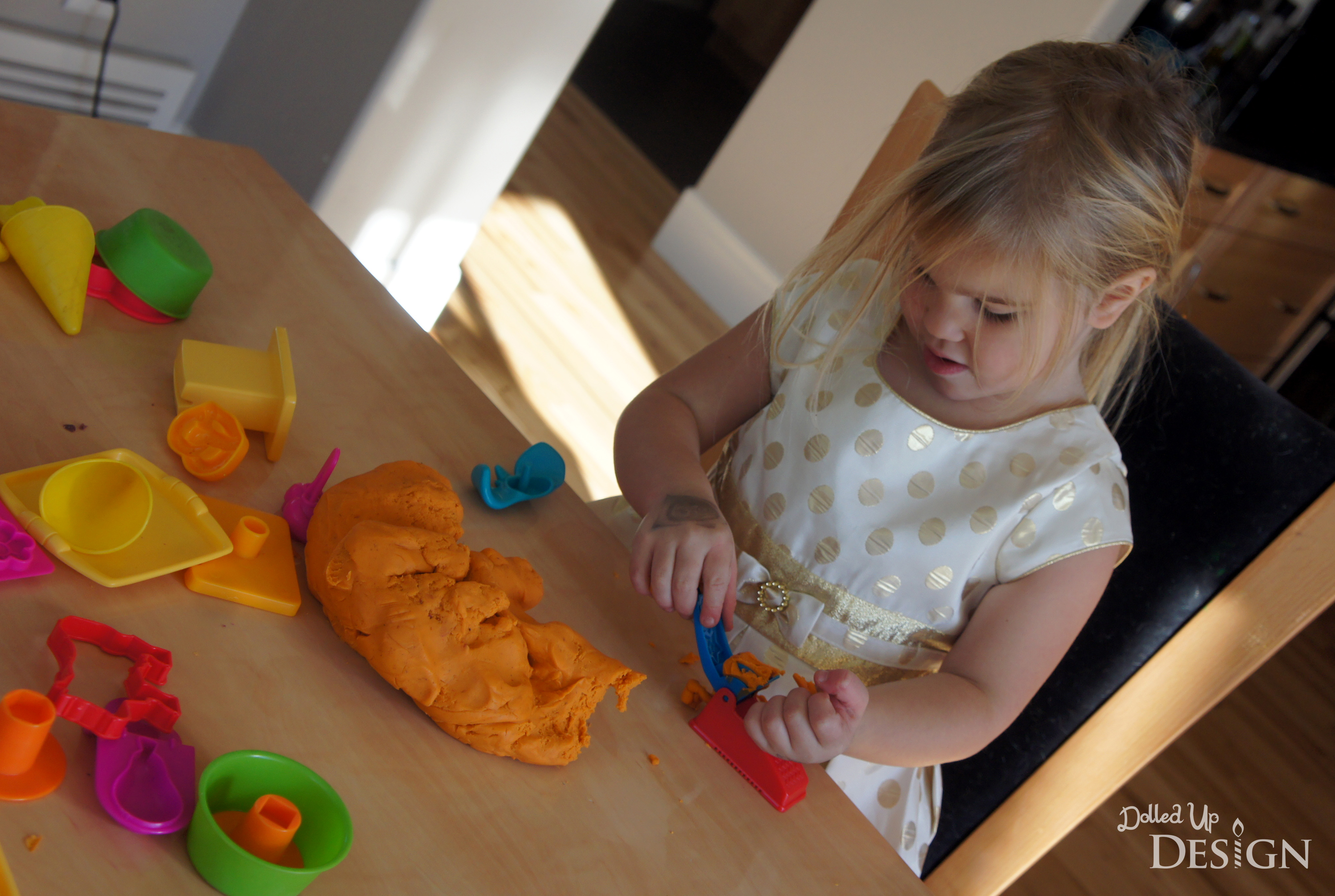 My 3 year old is really into playdough lately so I was excited to try this recipe for her. She had fun helping me mix the ingredients together and she could barely wait for it to cool to begin playing playing with it with her assortment of playdough tools and cookie cutters.