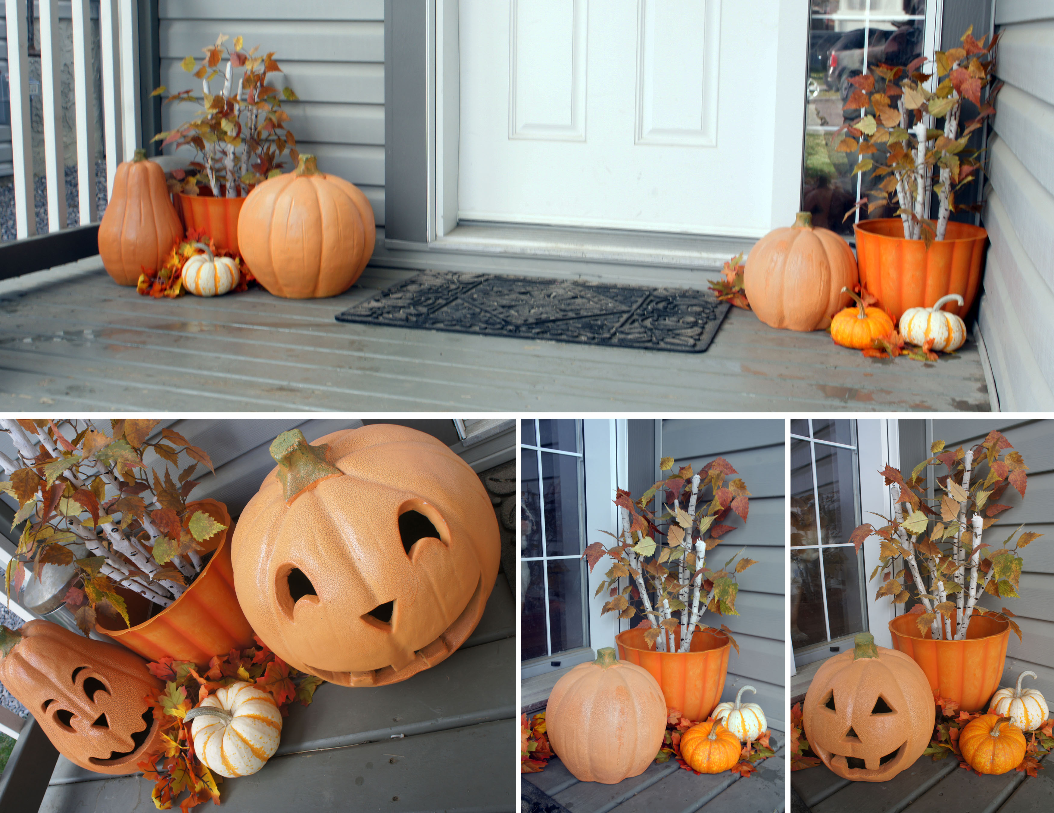The large pumpkins I use on my porch are ceramic and were found at Winner’s several years back. They were more expensive then a real pumpkin, but I like that they are something I can reuse year after year. Combined with a few small real pumpkins or gourds, it is a quick and easy holiday display.