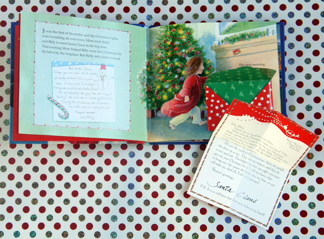I lucked out when I found this neat little book at the Dollar Store. It shows the correspondence between a young girl and Santa through envelopes filled with little letters on each page. I love that this book is so interactive and kids love discovering what is in the envelopes on each page.