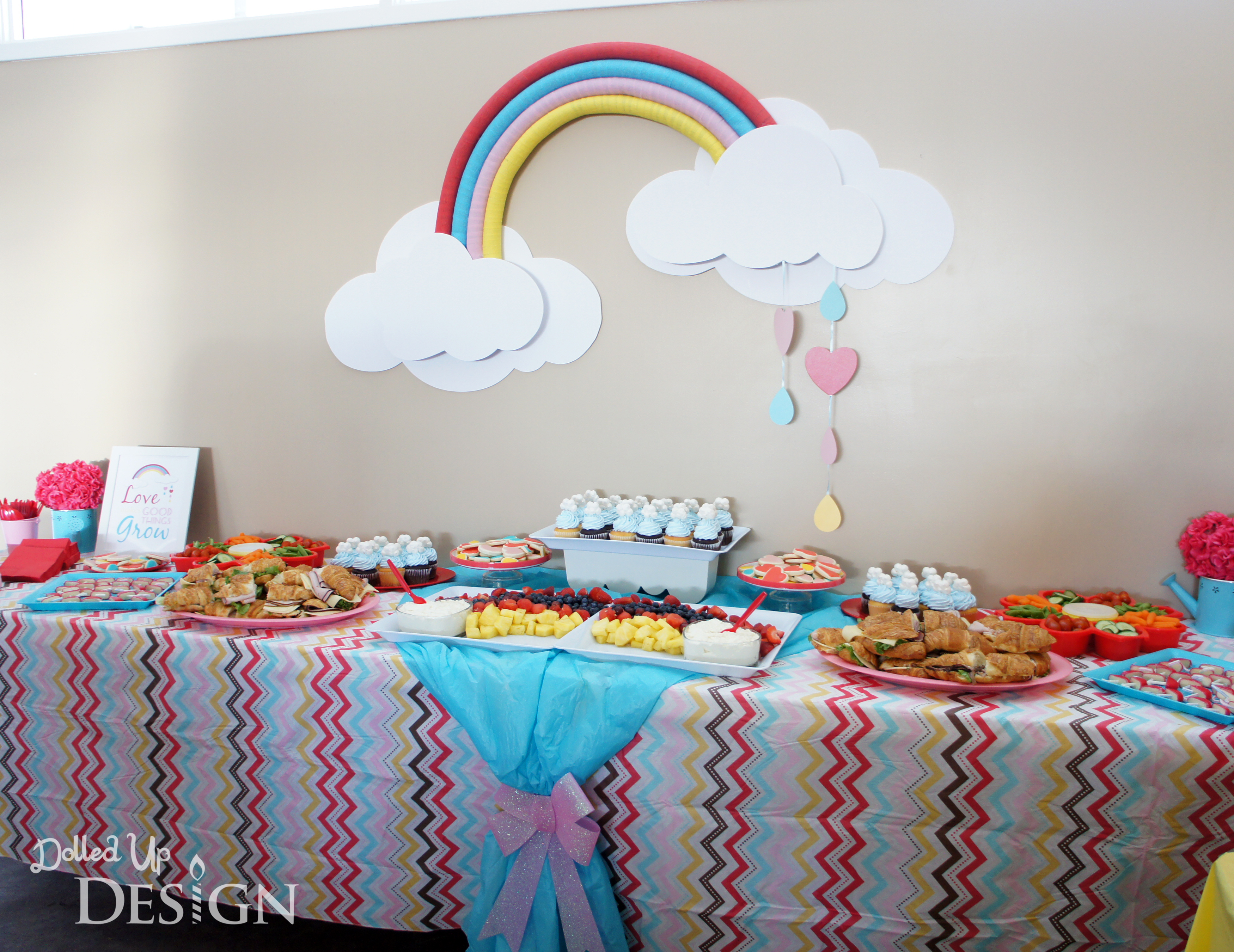 It was nice to be able to help out a friend by doing something I love, and lucky for me she trusted me enough to pass full creative control over. I had attended the gender reveal party so I knew the baby was going to be a girl and spent a lot of time perusing pinterest to try and come up with the perfect girly theme. I had seen these chevron printed tablecloths at Target that I loved, so I decided to pick a couple of them up to use for the food table. The baby is due in April so my mind went to April Showers which helped me settle on a rainbow theme using the color scheme from the tablecloths.