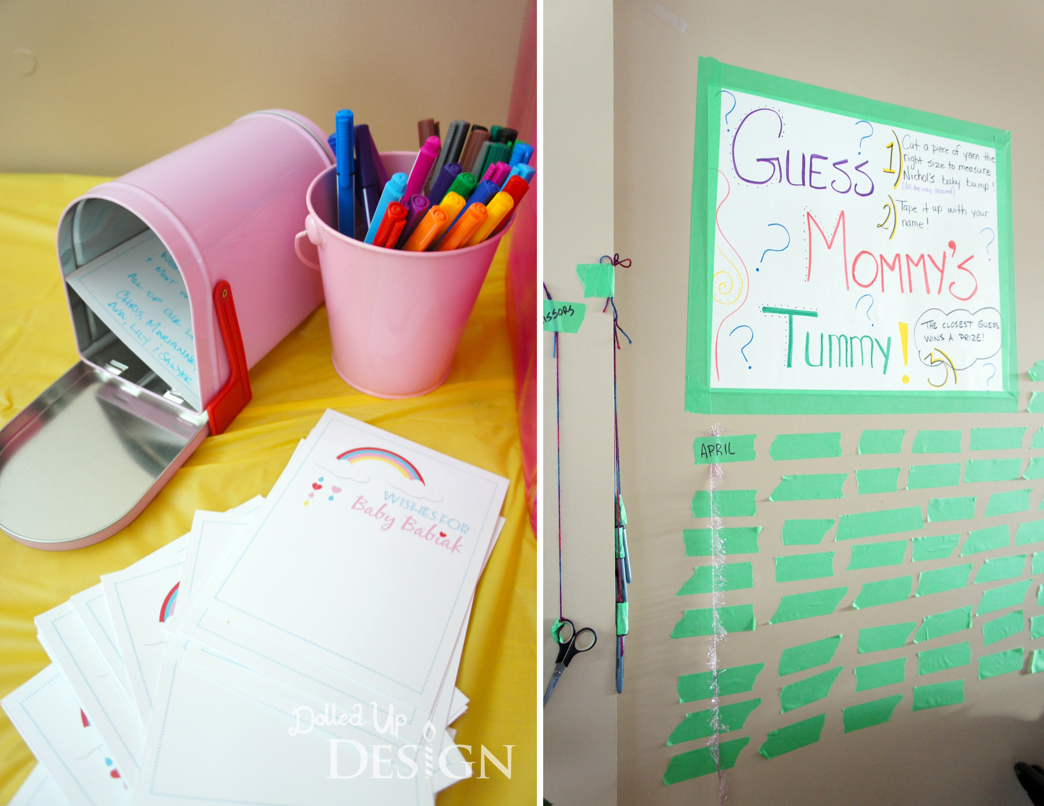 The guest of honor’s best friend also set up a Guess Mommy’s Tummy game where guests cut a piece of yarn to the size they thought would fit around the mommy’s waist. Her sweet 4 year old niece ended up being the closest and the consensus was that it was a direct result of how much time she spends hugging the little cousin growing in auntie’s tummy. 🙂
