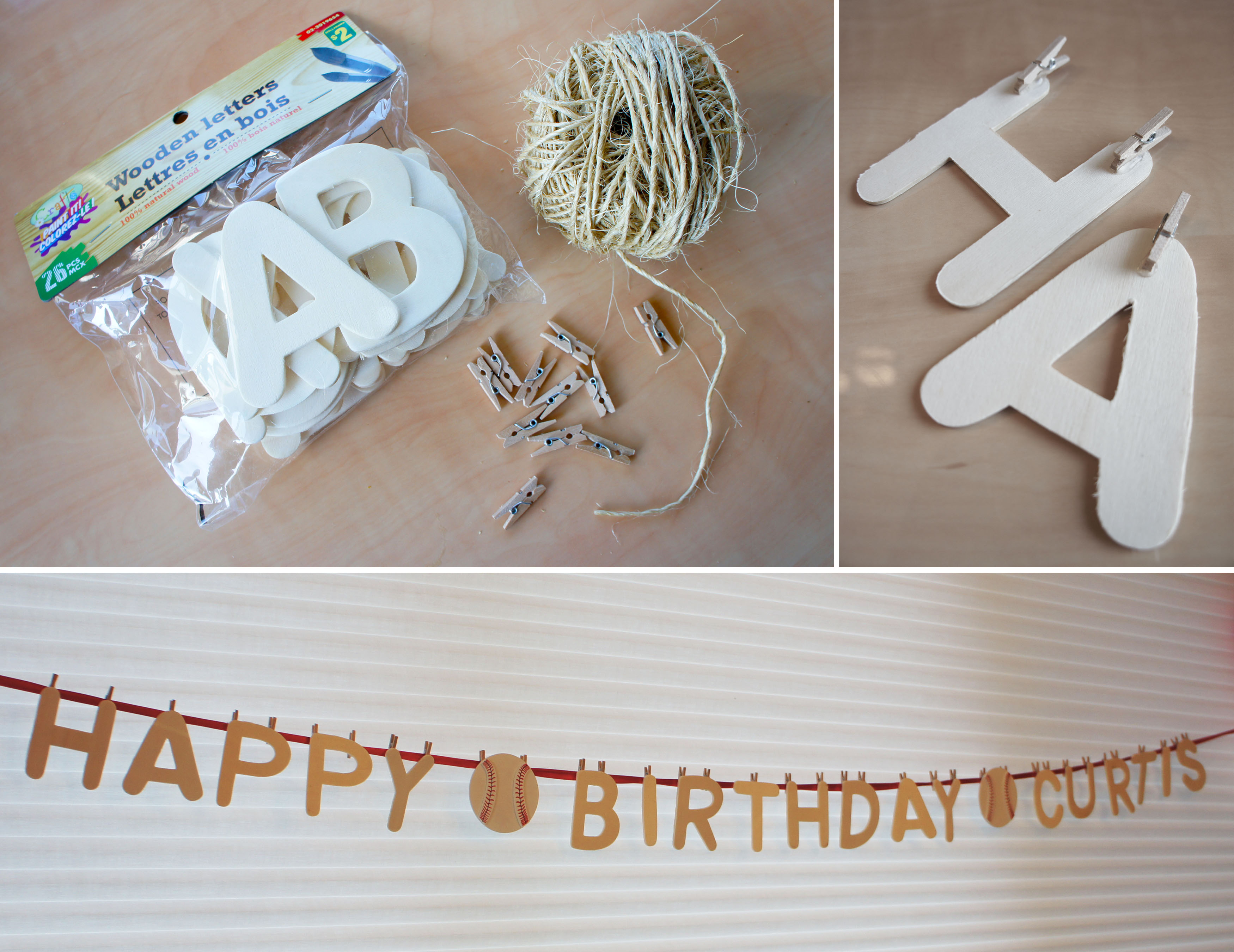 For the Snow White themed banner I picked up some apple wooden shapes at Micheals to fit in between the words. I loved the little extra touch they added so I decided to add baseball’s to daddy’s birthday banner. They have all kinds of great painted and unpainted wooden shapes at Michaels (pirate ships, puppies, lady bugs, cupcakes) so it wasn’t hard to find something that worked with my theme. To attach them, I hot glued the same mini clothespins on that I had used for the letters.