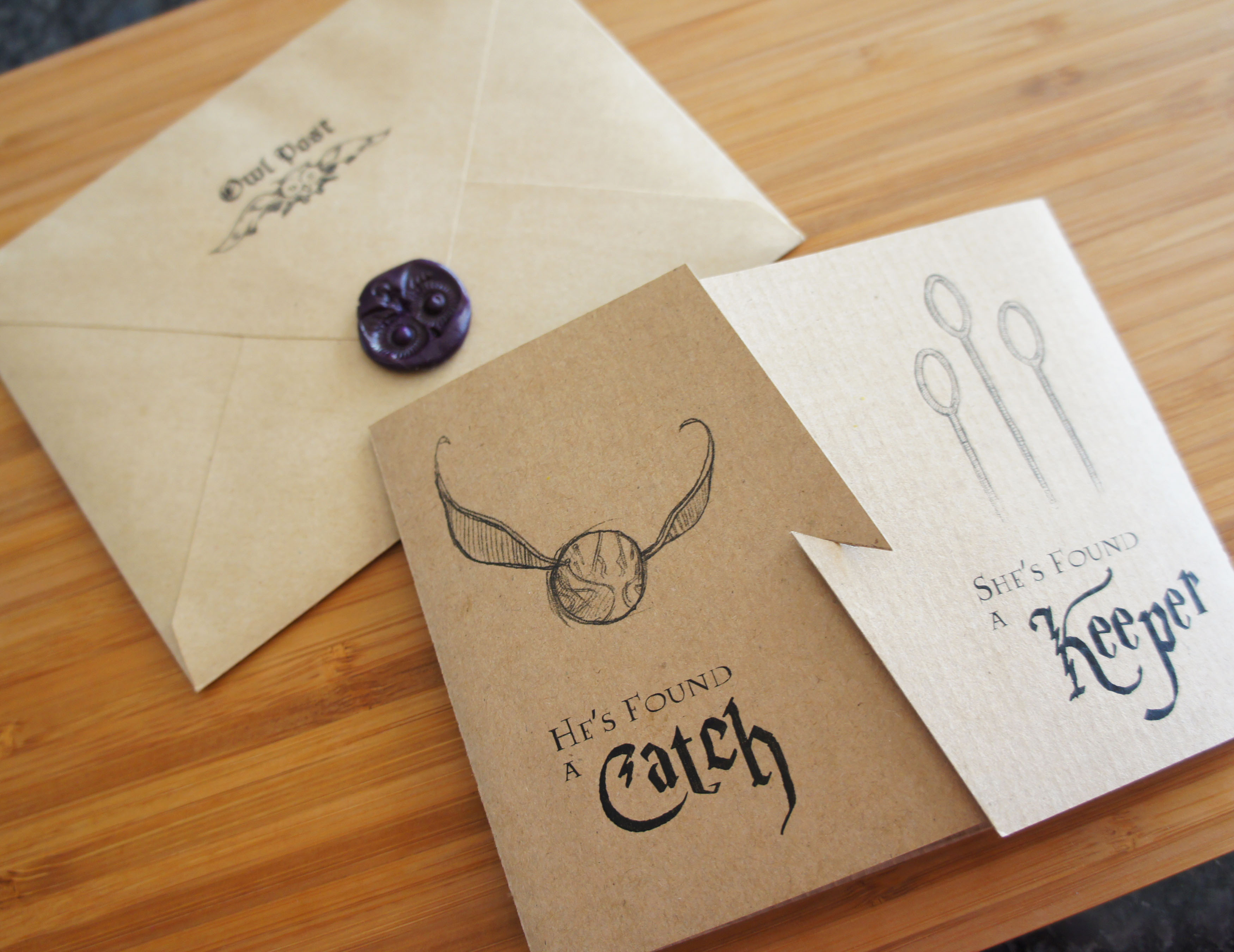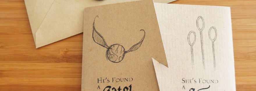 Borrowing the idea, I split my invite down the middle and put “He’s Found a Catch” on one side with the complimentary “She’s Found a Keeper” on the other half. To add interest, I incorporated an overlapping lightening bolt down the middle which both mimicked Harry’s birth mark and served as a way to close up the invitations. They was a bit of a pain to individually cut and score with my exacto knife, but luckily I only had 14 of them to make up!