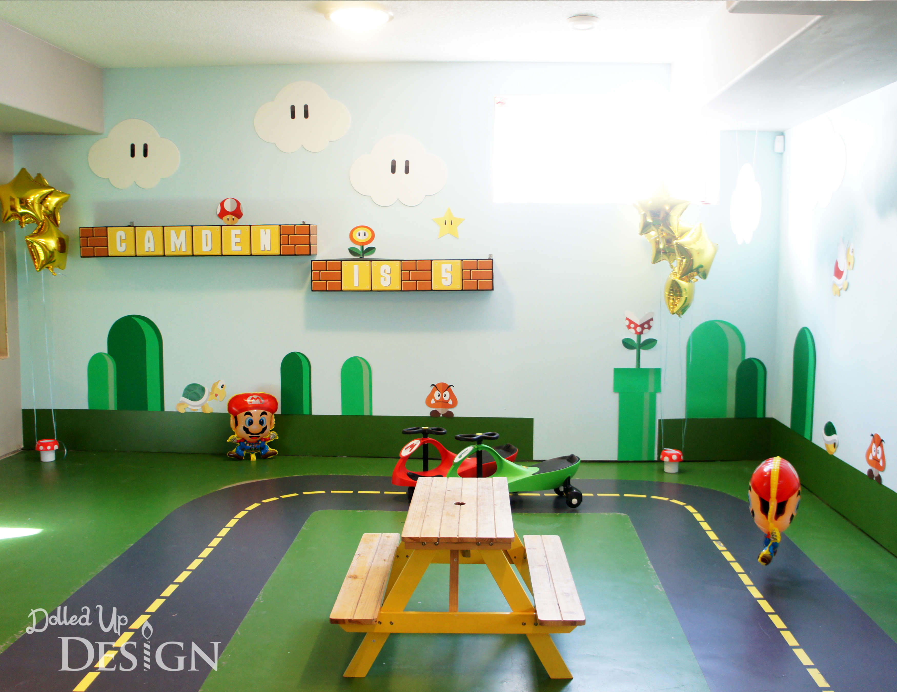 The kids each got a Plasma Car for Christmas and they just happened to be red and green so I decided to add on the red Mario “M” and a green “L” for Luigi so the kids could have Kart races during the party. These work great on the cement floor and I will admit to even have taken one for a spin around the newly painted track.