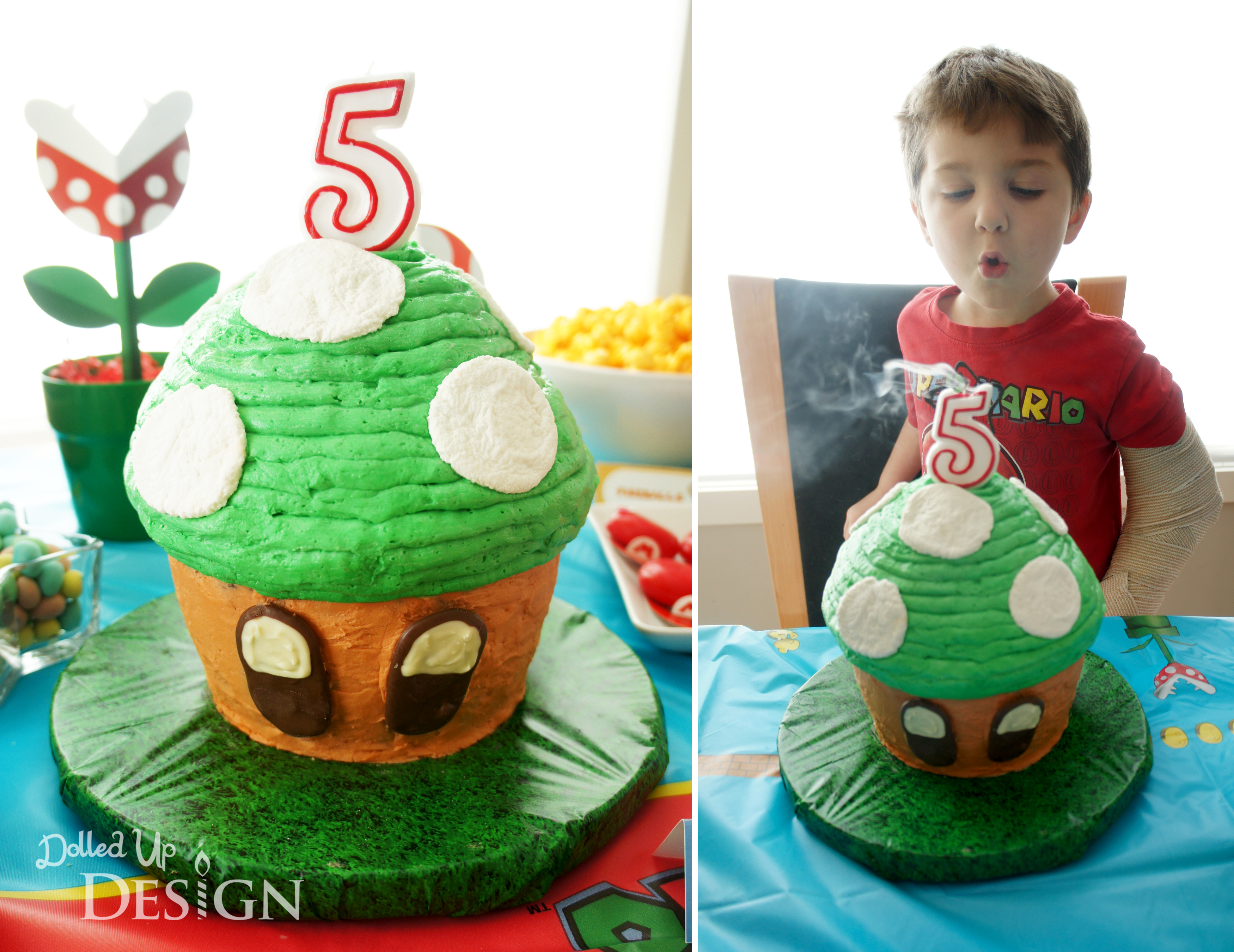 And, of course there was birthday cake! For the cake, I decided to use my giant cupcake pan and try to make a mushroom. I was intending to make the top red, but the birthday boy requested his favorite color green and I didn’t see any good reason to convince him otherwise. To make the white spots on the mushroom top, I simply took my rolling pin to some large marshmallows. It is not perfect, but I was pretty happy with the end result.