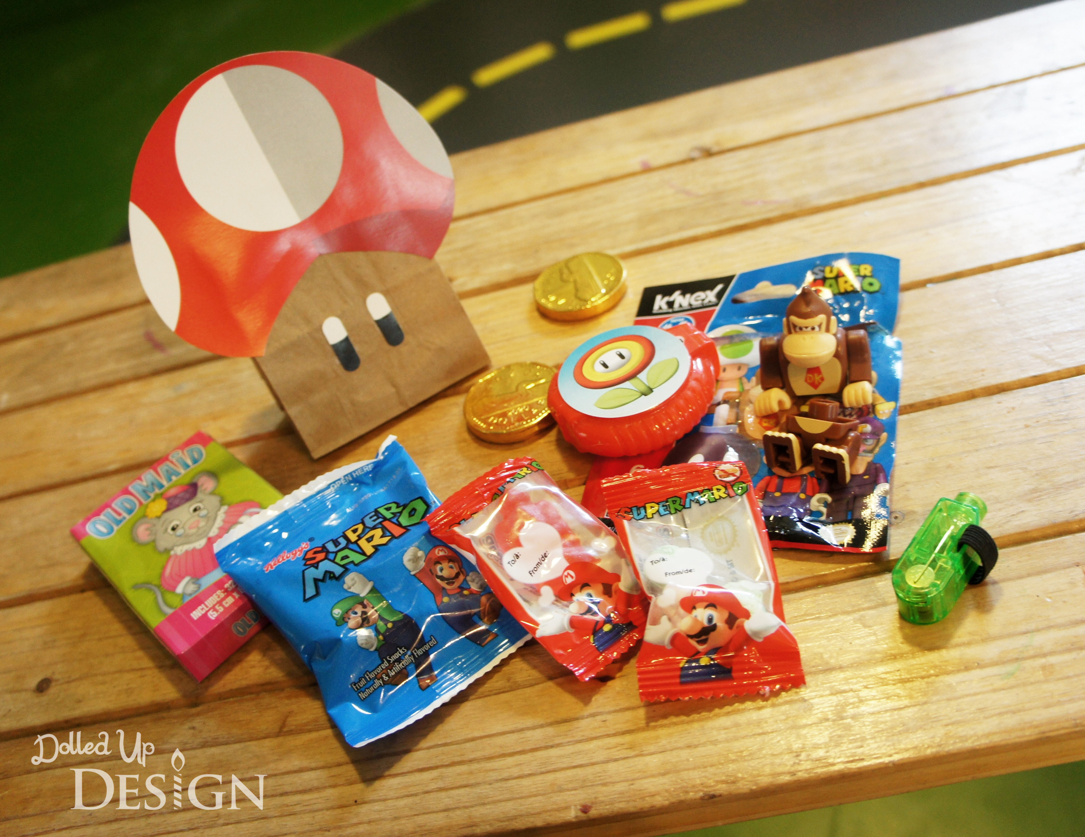 The loot bag items included K’nex Mario figure mystery bags, Mario themed fruit snacks, chocolate coins, bubble gum tape, finger lasers and some other small Mario candies I found in the Valentine’s section at Dollar Tree. I also gave each guest a card game set as they were leaving.