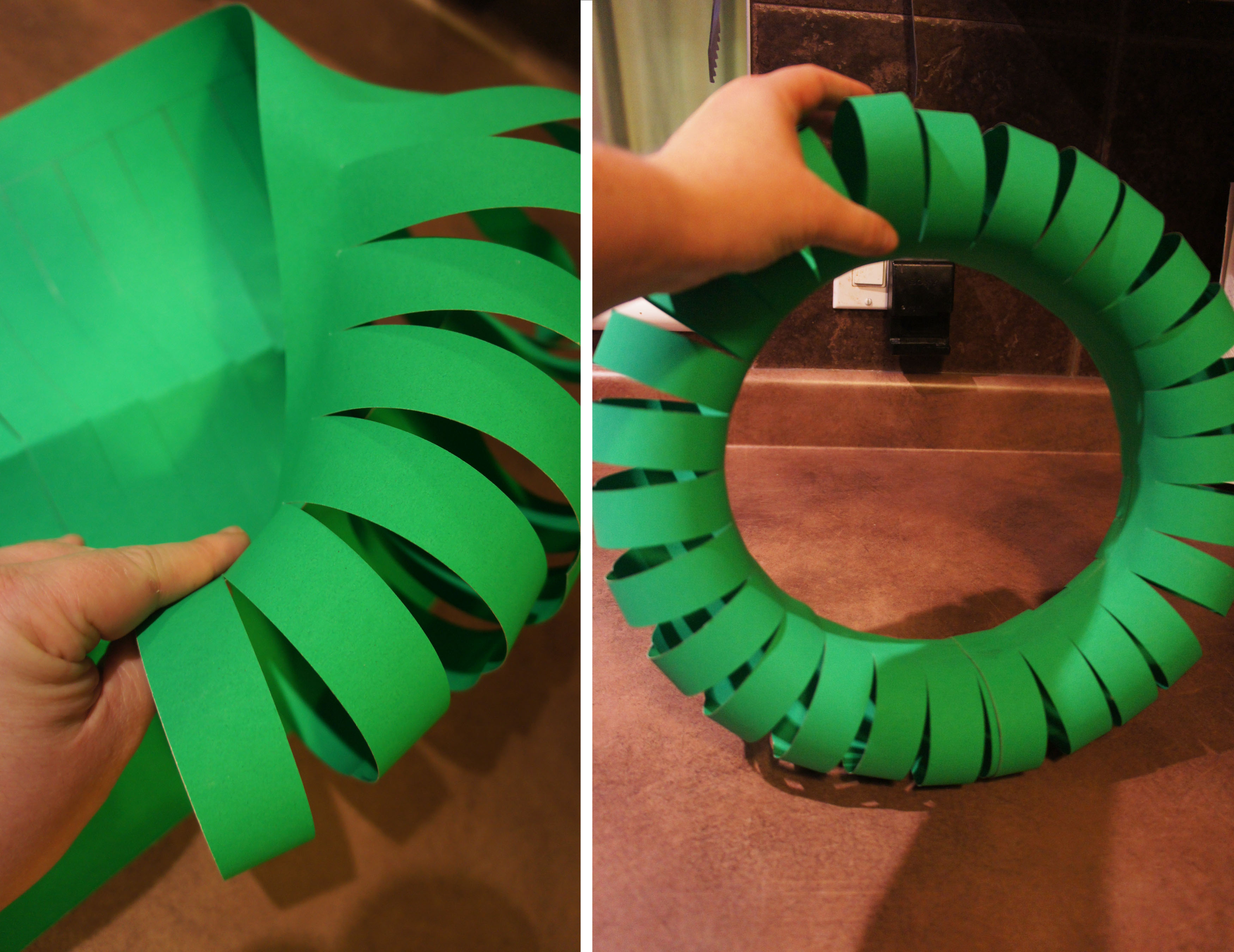 I found and followed the Construction Paper Wreath Tutorial from Our Small-Town Idaho Life, with mine just being on a bit larger scale. The posterboard was a bit awkward to work with due to it’s size and stiffness, but it was worth it for the impact the finished wreaths make.