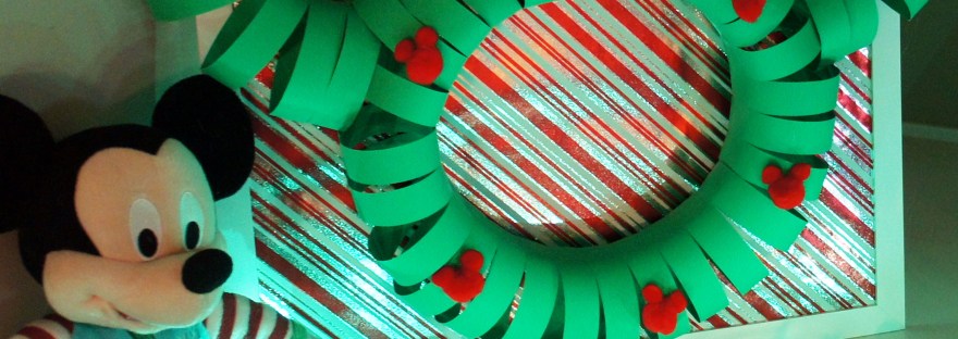 My initial idea for the mantle was to do a large wreath. I had seen other crafters versions where they had various sized artificial wreaths zipped tied together to form a Mickey shape and thought that would be easy enough. Unfortunately I didn’t have any luck finding smaller sized wreaths for ears, so I went to my plan B which was to buy foam wreath forms from Michaels and wrap them in green garland. Well, the price on the styrofoam shapes was more then I was expecting so I decided it just wasn’t worth it and moved on to a plan C – cutting and crafting my own paper wreaths from Dollar Store posterboard. And, because I had done Mickey and Minnie versions of everything else, it only made sense that I would make 2 versions of the wreaths.