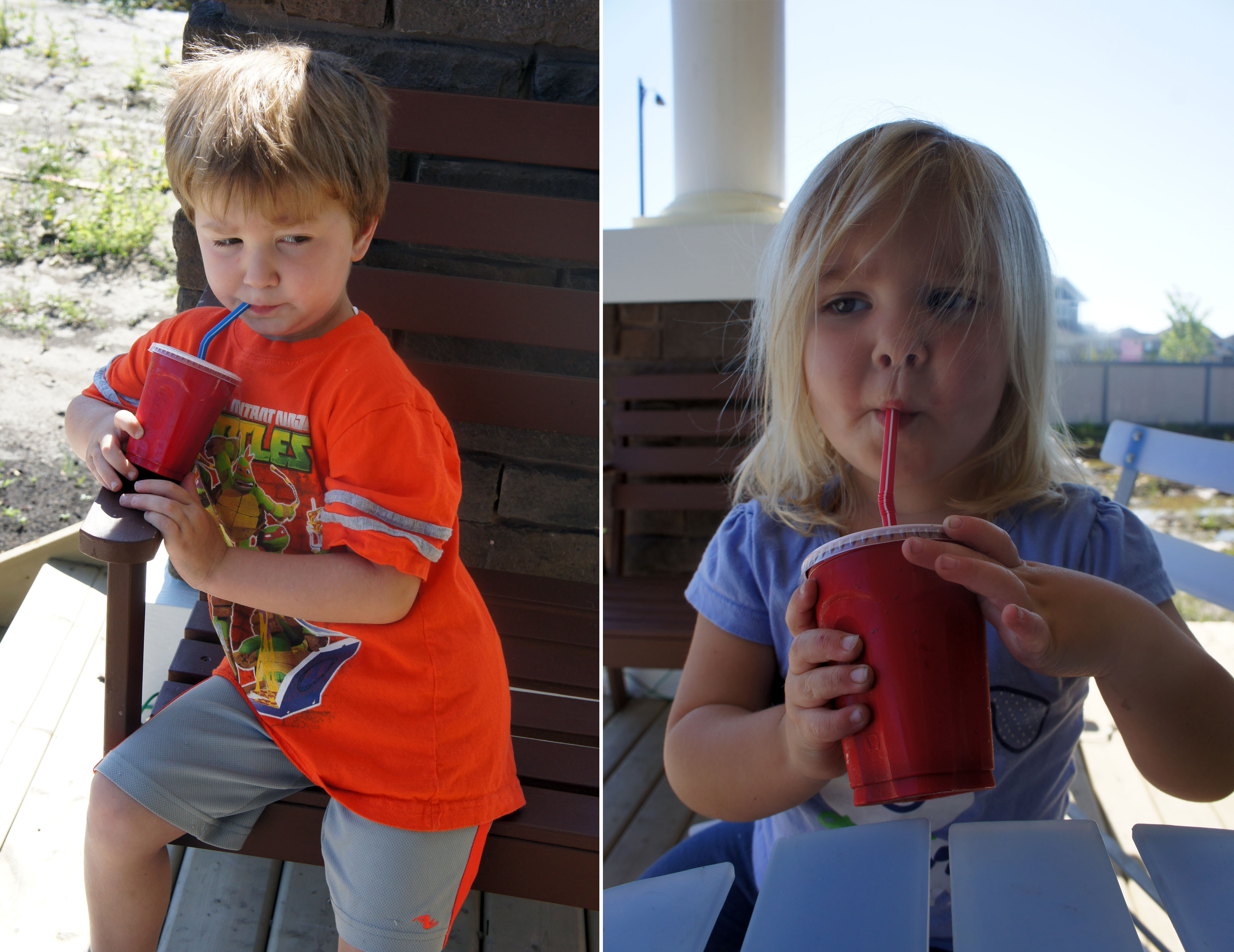 Last summer Tim Horton’s still offered an XS sized cup that was the perfect size to get my then 3 year old a smoothie or Frozen Lemonade all his own.  This has been discontinued and their smallest size is now way too big for just one of my kids, but not quite enough to split two ways.  One day, since we were headed right home, I had the brilliant thought to just order a medium Frozen Lemonade and split it into their sippy cups when we got home.   A medium is far cheaper then two smalls and there is way less drink wasted this way.